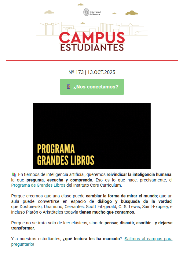 El boletín semanal de los estudiantes de la Universidad de Navarra. Cuenta la vida universitaria en estado puro, historias de alumnos, de dónde venimos, a dónde vamos, avisos importantes... ¡Todos los lunes en tu correo!