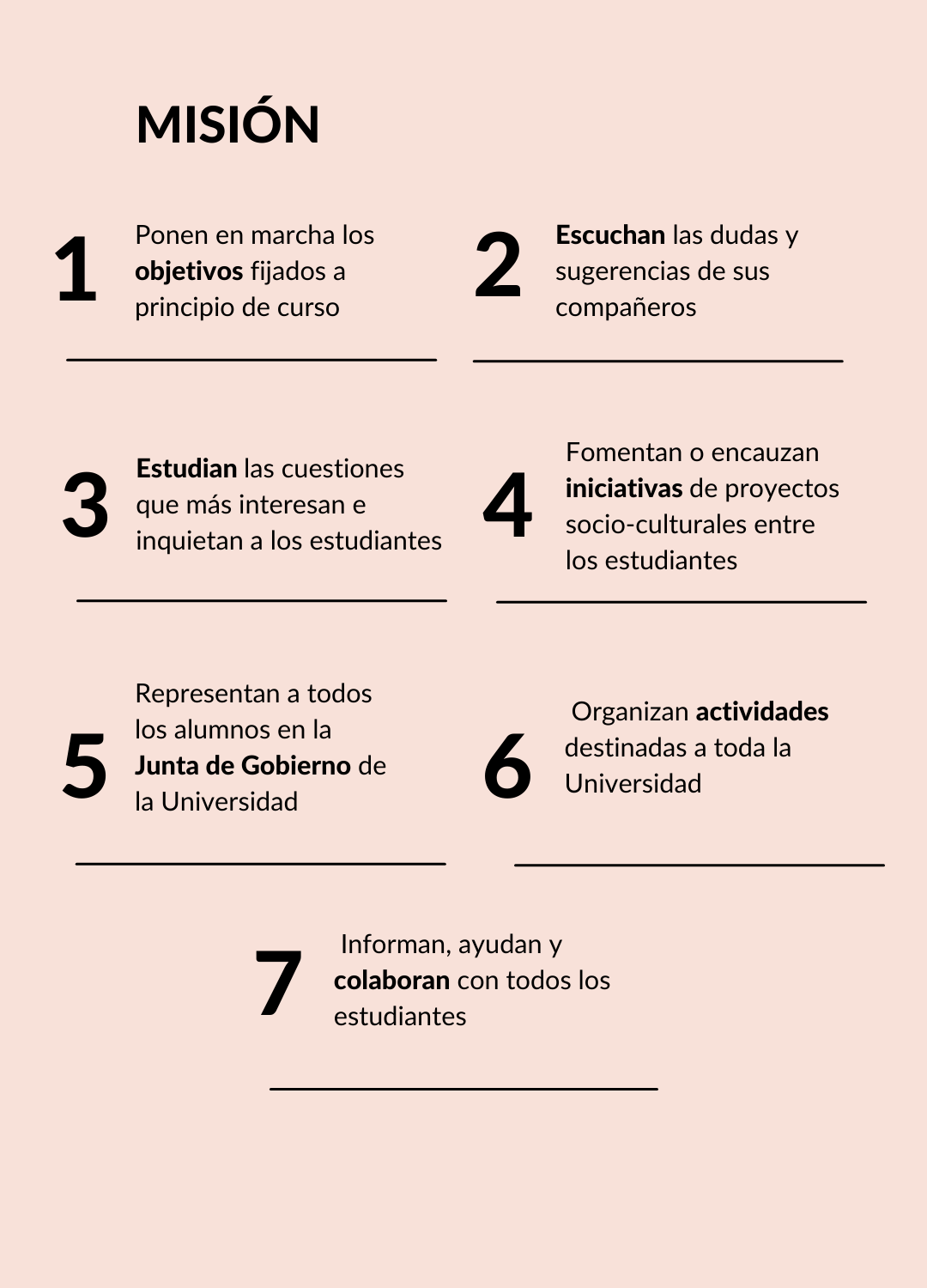 Los delegados son el nexo de unión entre los estudiantes y la Universidad y representan a sus compañeros. La Representación Estudiantil de la Universidad está compuesta por el delegado y subdelegado de cada facultad y escuela de la Universidad. Se reúnen periódicamente para decidir sobre los objetivos marcados a principio de curso, y también sobre las sugerencias que llegan de todos los estudiantes. Una vez valoradas las propuestas, buscan dar una vía de solución a través del vicerrectorado de Estudiantes. En total son 31 representantes.