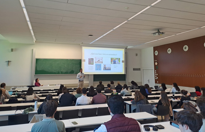 La presentación de la jornada, a la que asistieron más de 50 personas, corrió a cargo de Enrique Aubá, coordinador del proyecto “Salud y bienestar” de la Estrategia 2025 de la Universidad. La estructura de la sesión, impartida por Arturo Lecumberri, psicólogo de la Unidad de Orientación y Bienestar, y Raquel Cascales, filósofa, profesora de la Escuela de Arquitectura y del Instituto Core Curriculum, se inspiró en ideas del libro “Pensar rápido, pensar despacio”, del psicólogo israelí-estadounidense Daniel Kahneman, premio Nobel de Economía en 2002.