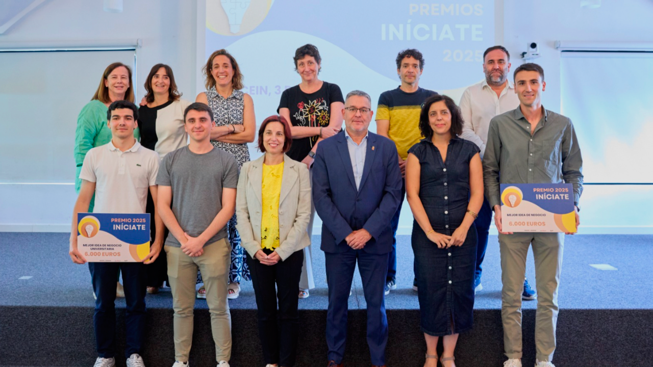 Xabier Hernández (izquierda) y Joaquín de Carlos (derecha), posando con sus galardones junto al consejero de Universidad, Innovación y Transformación Digital, Juan Luis García; la directora gerente de CEIN, Uxue Itoiz; la directora general de Innovación, Agurtzane Martínez; y el jurado de los premios.