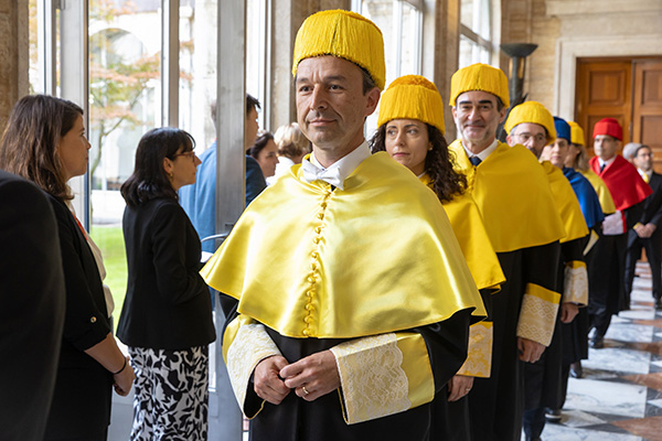 Ataviados con las vestes académicas, hoy más de doscientos doctores han enfilado los cerca de 60 metros que separan el Salón de Grados del Aula Magna. Es allí donde tiene lugar el acto académico desde 1964, año en el que concluyó la construcción del edificio Central, primera piedra del actual campus.