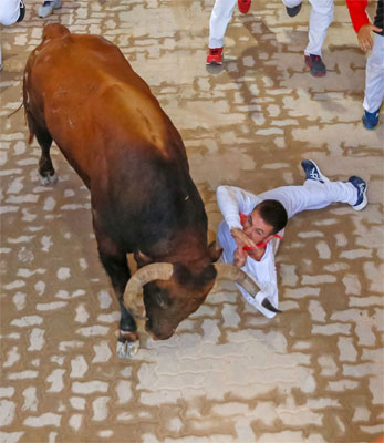 El tramo que más le gusta a Manuel es el callejón. “El encierro es cada vez más rápido y ya no hay tantos toros sueltos como antes. Al final del recorrido, la manada va más estirada y eso ayuda para poder sacar buenas fotos”. De hecho, de todas las instantáneas que Manuel ha sacado en el encierro, su favorita es una que tomó en ese tramo. “Capté el momento de una cogida. Cuando estás ahí siempre quieres que pase algo para tener la foto, pero, a la vez, esperas que no sea nada grave. En este caso, gracias a Dios, no lo fue”, concluye.