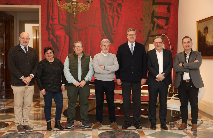 FotoManuel Castells/En la firma del convenio estuvieron presentes, de izda. a dcha., Emilio Lezana, Pilar Piñeiro Gallego, Demetrio Muñoz Ruiz y Juan Las Navas Lacalle, de la Fundación Laboral de la Construcción; e Igor Errasti, Carlos Naya y Eduardo Domingo, de la Universidad de Navarra