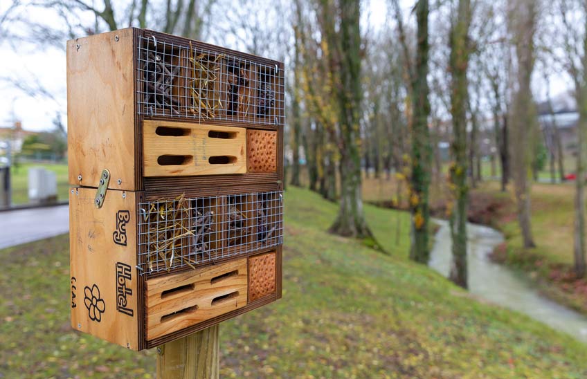 Un grupo de 17 alumnos de cuarto curso del Doble Grado en Biología y Ciencias Ambientales de la Universidad de Navarra han construido dos habitáculos para albergar insectos. Con estos “hoteles” se pretende dotar de un refugio a los insectos polinizadores y otros animales con actividad beneficiosa para el medioambiente como, por ejemplo, los depredadores de plagas.